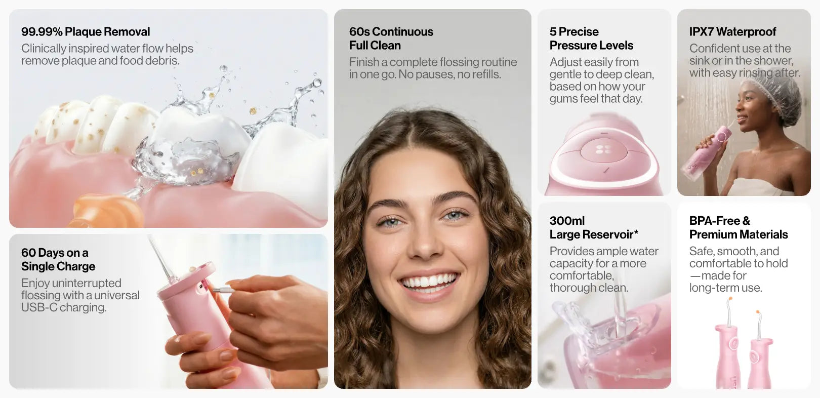 - C30 Cordless Water Flosser › — Cordless, with adjustable water pressure for thorough flossing.